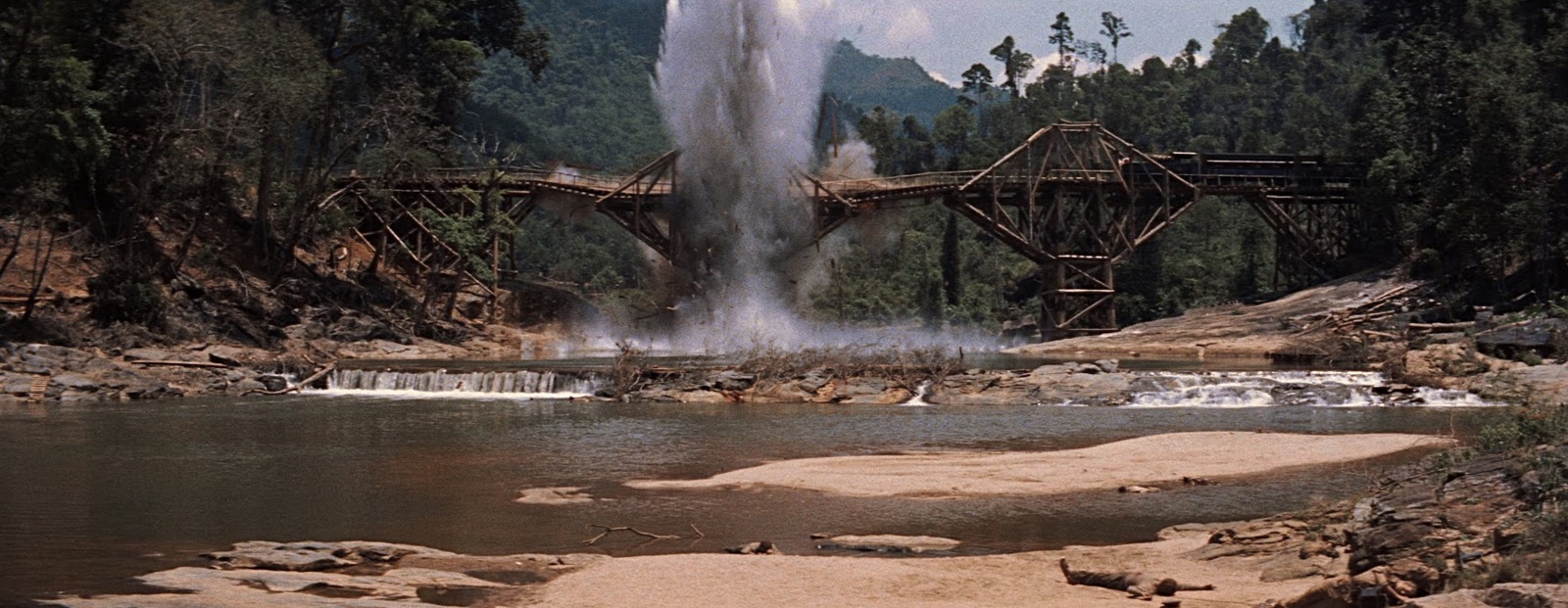 En attendant le passage du convoi, le colonel Nicholson aperçoit le dispositif de destruction, le niveau de la rivière ayant baissé durant la nuit.